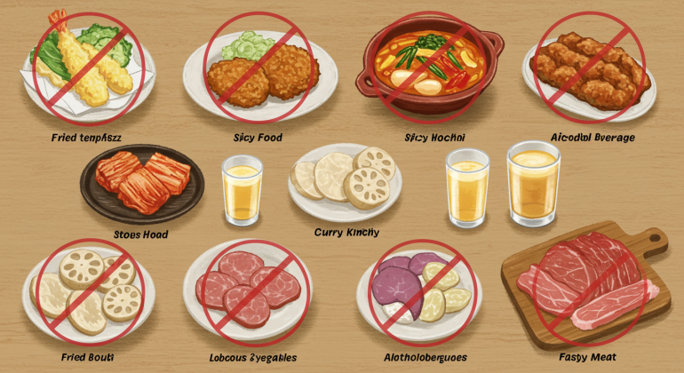 - ・食事内容:消化の良い食品を選び、脂っこいもの・刺激物・繊維質の多いものは避ける